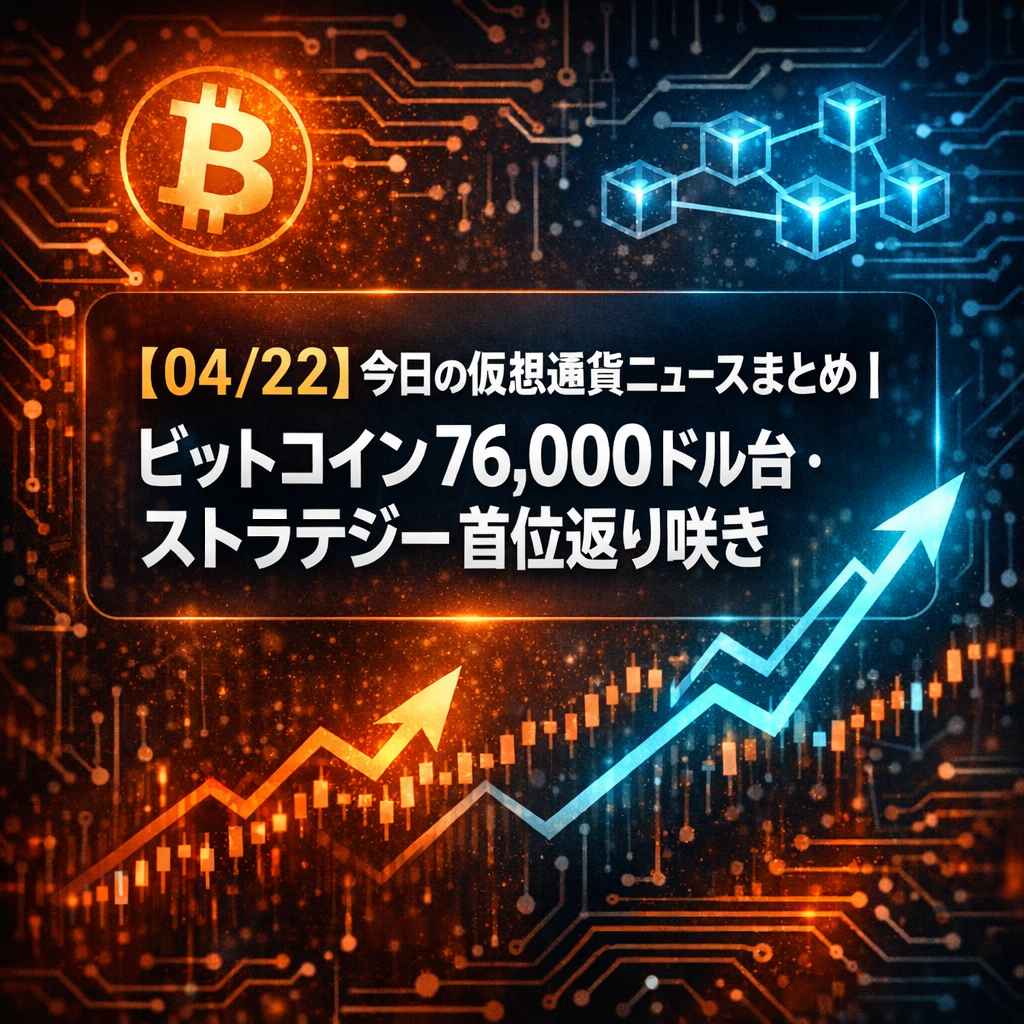 【04/22】今日の仮想通貨ニュースまとめ|ビットコイン76,000ドル台・ストラテジー首位返り咲き